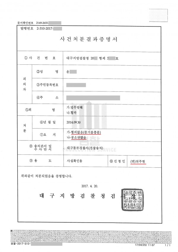 무혐의(업무방해), 공소권없음(협박)