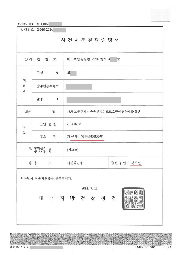 1. 대구지방검찰청 2014형제 3****호