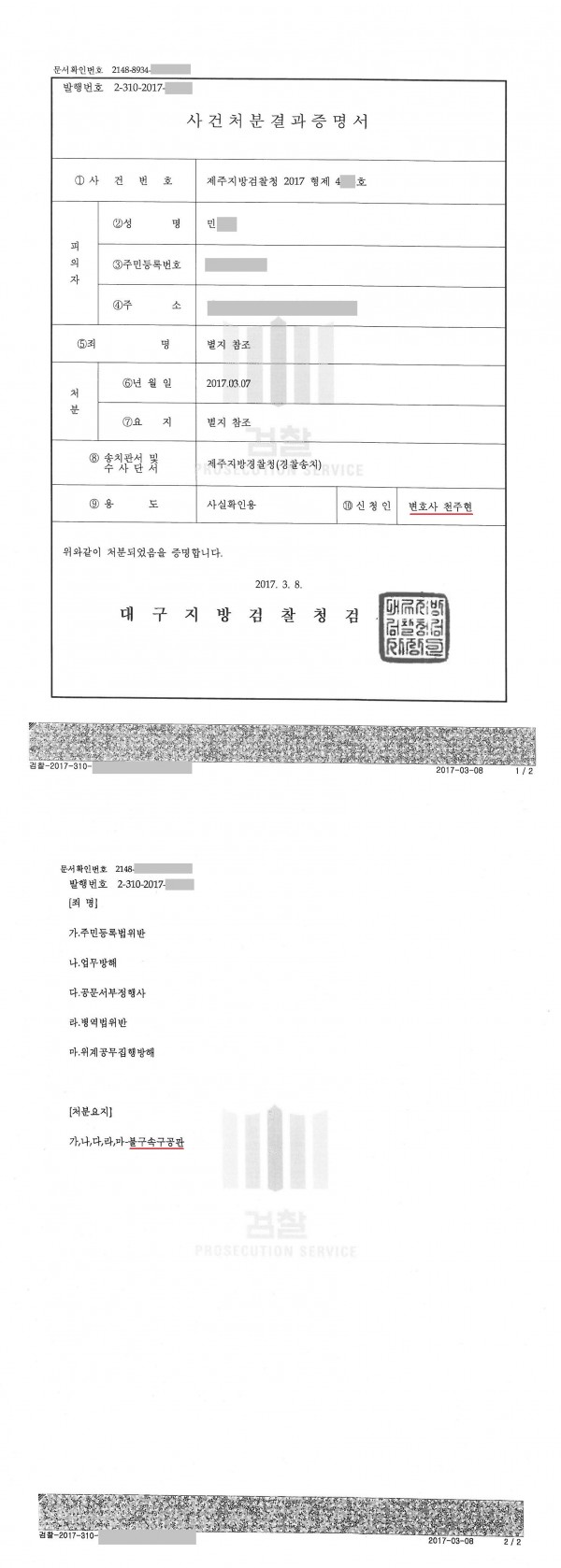 ▷ 주민등록법위반, 업무방해, 공문서부정행사, 병역법위반, 위계공무집행방해