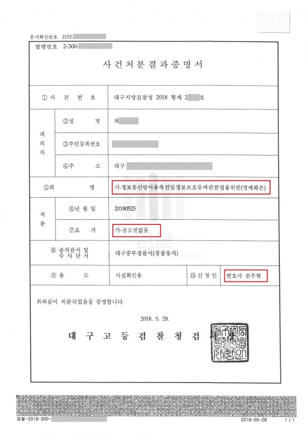고소한 범죄사실 모두 혐의 인정됨. 검사가 압수수색검증영장을 발부받아 주요 커뮤니티 운영사인 포털사를 압수수색하였으나, 기술적 문제로 피의자 특정시까지 기소중지(불법성 확인)